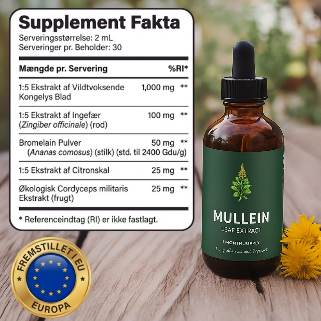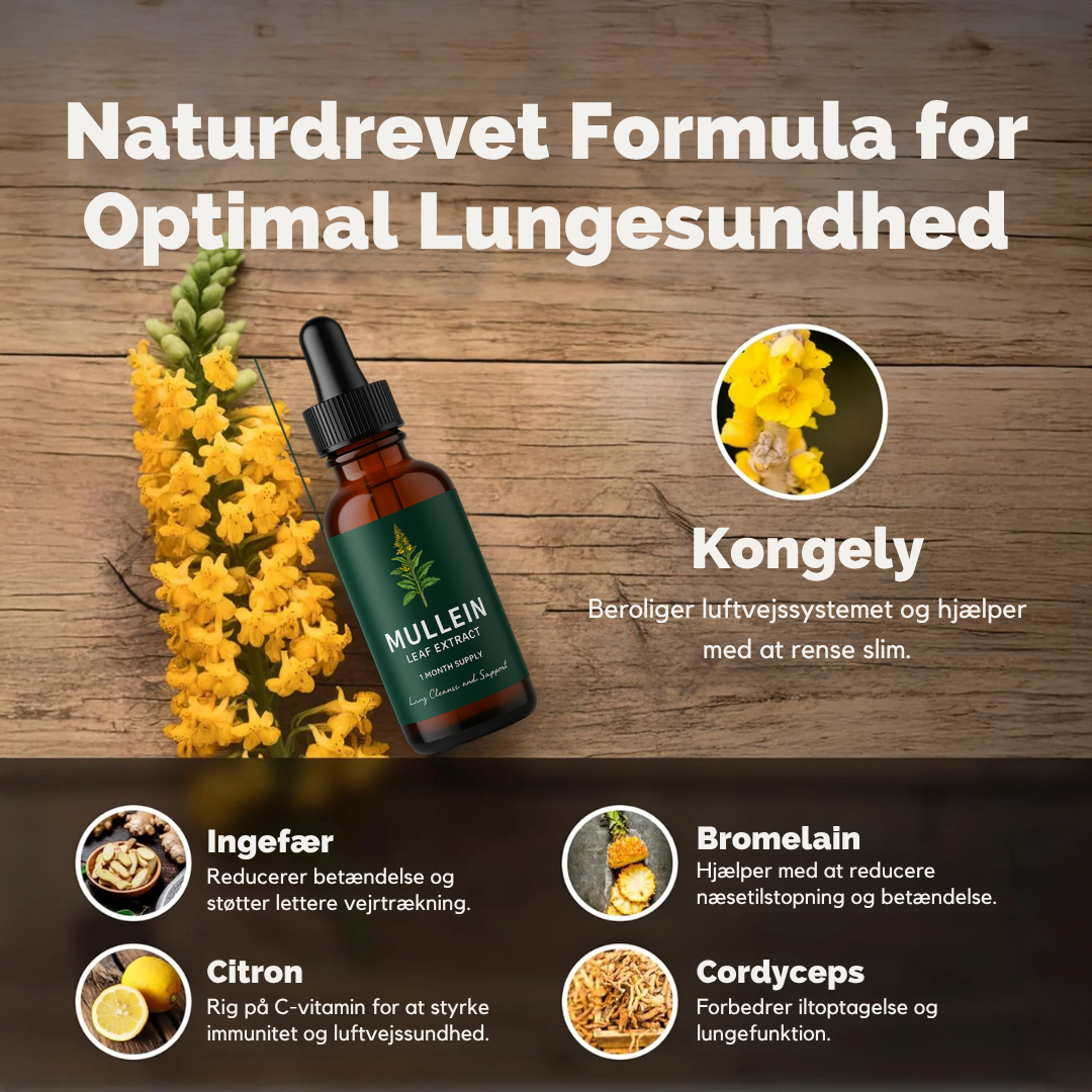 - Kongelysbladekstrakt (2000mg ækvivalent) — kendt for at støtte slim-clearance og berolige lungevævet